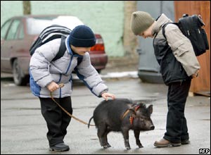 Pets are often a source of great ammusement to me in cities. Growing up in the country it made sense to have a pet, hell I had a friend who had a "pet" cow, animals are everywhere so why not enjoy them. But city people seem to find some interesting animals to make as pets. I recall a time I was walking home from the bar at about 3 am and came across someone walking what looked to be a slender cat on a leash. It was only after I had bent down to pet it and it had crawled halfway up my arm that I realize this was not cat...this woman was walking a freaking ferret! After seeing that I kind of figured I'd pretty much seen the oddest pet to be walked in a city, until Tuesday. I was out riding on a bike path and notice a woman walking a plump dog near the path. Wrong again, that was no dog, it was a pig. Now why is it that I never saw that out in the country?
